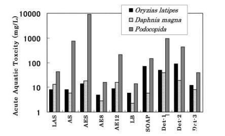 7 种表面活性剂和 3 种商品化剂的急性毒性 使用 3 种测试生物测量清洁剂: oryzias latipes、daphnia magna 和 podocipida。 结果 如图 1 所示。在所有情况下,EC50 和/或 LC50 podocopida 高于 oryzias latipes 和 daphnia magna。 SOAP 和 LB 的毒性值 oryzias latipes 高于 daphnia magna, 而其他 5 种表面活性剂的毒性值 oryzias latipes 或 daphnia magna 几乎相等。 这 表面活性剂可分为三类; 低毒 组(AES、SOAP 和 AE12),中毒性组(LAS 和 AS) 和高毒组 (AE8 和 LB)。