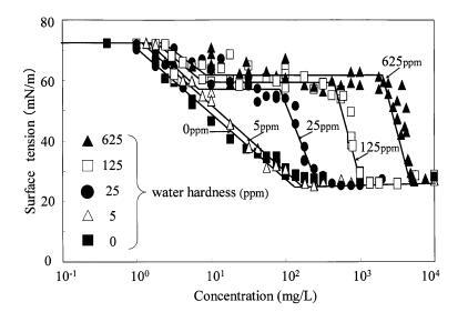 图 7 水硬度对表面张力的影响 肥皂曲线。