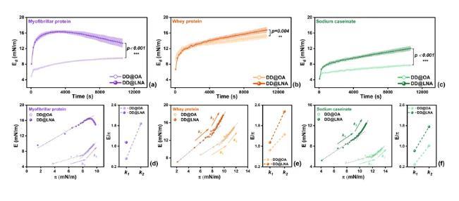 图4.线性粘弹区域内(振幅10%),不同饱和度界面上(a)MP,(b)WP和(c)SC界面膜的弹性模量;(d)MP,(e)WP和(f)SC界面膜的膨胀模量-界面压力关系图。*p<0.05,**p<0.01,***p<0.001