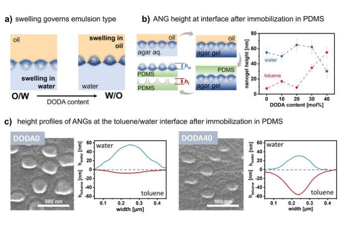图4的主要内容是关于纳米凝胶在甲苯/水界面的膨胀、位置和变形。作者通过实验研究了不同亲水性纳米凝胶在甲苯/水界面上的行为。实验使用了不同亲水性的纳米凝胶(DODA0-DODA40),通过在凝胶陷阱技术中固定纳米凝胶在油/水界面上,然后通过原子力显微镜(AFM)测量纳米凝胶在水和甲苯中的突出高度。结果表明,亲水性较强的DODA0纳米凝胶在水中突出较高,而在甲苯中突出较低;而亲水性较弱的DODA40纳米凝胶在水中突出较低,而在甲苯中突出较高。这些结果表明,纳米凝胶的亲水性会影响其在油/水界面的位置和膨胀行为,从而影响其乳化能力。亲水性较强的纳米凝胶更倾向于与水相相互作用,而亲水性较弱的纳米凝胶更倾向于与油相相互作用。
