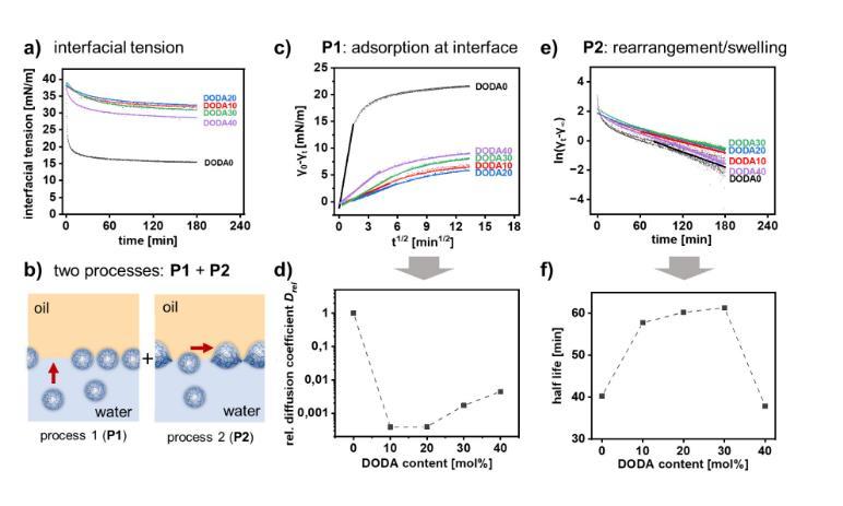 图3展示了不同疏水性纳米凝胶(ANGs)在甲苯/水界面张力(IFT)方面的研究结果。随着ANGs的疏水性增加,甲苯/水界面张力随时间非线性降低,但不同ANGs的降低速率不同(图3a)。IFT的降低分为两个阶段:初始快速降低(P1)和随后缓慢松弛到平衡状态(P2)(图3b)。通过分析P1阶段,可以得到描述ANGs界面吸附速率的扩散系数D(图3c)。不同ANGs的相对扩散系数Drel(相对于DODA0)与ANGs的DODA含量相关:亲水的DODA0和疏水的DODA40显示出最快的界面吸附速率(图3d)。通过分析P2阶段,可以得到描述ANGs重新排列速率的半衰期(图3e)。半衰期与ANGs的DODA含量相关:亲水的DODA0和疏水的DODA40显示出最快的重新排列速率(图3f)。
