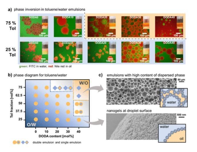 图2展示了使用不同亲水性纳米凝胶(DODA含量)制备的甲苯/水Pickering乳液的类型。具体来说,图2a通过荧光显微镜图像和照片显示了不同DODA含量下的甲苯/水乳液,其中25 vol%的甲苯观察到O/W乳液,而在75 vol%的甲苯中,从DODA10到DODA20观察到从O/W到W/O的相变。图2b总结了甲苯/水乳液系统中乳液类型对纳米凝胶的DODA含量和乳液的油相体积分数的依赖性。图2c通过SEM图像展示了高分散相含量(DODA40,Tol-75)乳液和纳米凝胶(DODA20,Tol-25)在粒子/液滴表面的存在。