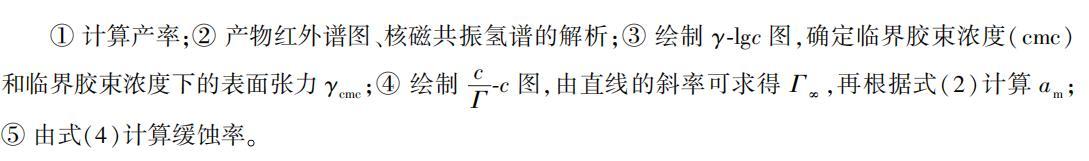 仪器:NEXUS470傅立叶红外光谱仪,Bruker AVANCE III核磁共振仪,R-1002旋转蒸发仪,WRS-1B数字熔点仪,DZ-2BC真空干燥箱,JJ-1电动搅拌器,恒温水浴锅,JK99B自动张力仪,BS-210S电子天平,干燥器,N80钢片(长伊宽伊高=40mm伊13mm伊2mm),医用纱布,毛刷,医用金属镊子,脱脂棉,绸子,铁砂纸,250mL三口烧瓶1只,回流冷凝管等。
