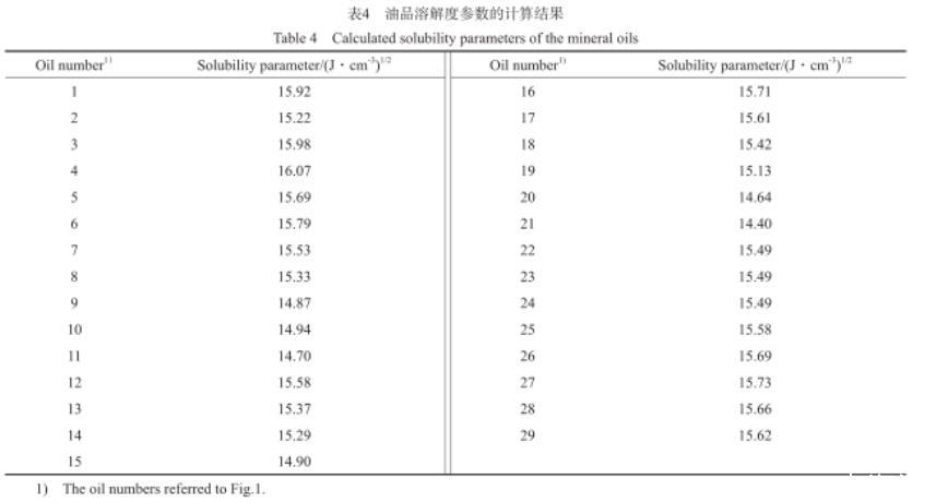 表4油品溶解度参数的计算结果