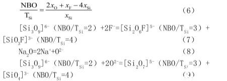 熔体表面张力与熔渣结构的聚合程度密切相关。连铸结晶器保护渣属于硅酸盐,硅酸盐熔体中含有不同聚合程度的硅氧阴离子团。熔渣结构的聚合程度用符号“NBO/TSi”表示,其计算公式如式(4)所示。NBO/TSi值越小,说明熔体聚合程度越高。将预熔渣和静滴法测定后的渣样成分分别带入到式(6)中,计算结果如表2所示。从表中可以看出,静滴法测定后渣样的NBO/TSi值小于预熔渣的NBO/TSi值,说明静滴法测定后的渣样熔体结构聚合程度高于预熔渣熔体结构聚合程度。这是由于F-能降低熔渣结构的聚合程度,将高聚合程度的硅氧阴离子团逐渐解聚成低聚合程度的硅氧阴离子,同时Na2O电解出O2-,O2-的出现亦可降低熔体的聚合程度,反应式见(7)~(9):