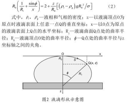 静滴法是根据在水平垫片上自然形成的液滴形状(如图2所示)以及Young-Laplace方程来计算表面张力,式(2)即为静滴法根据液滴外形计算表面张力的基本方程:
