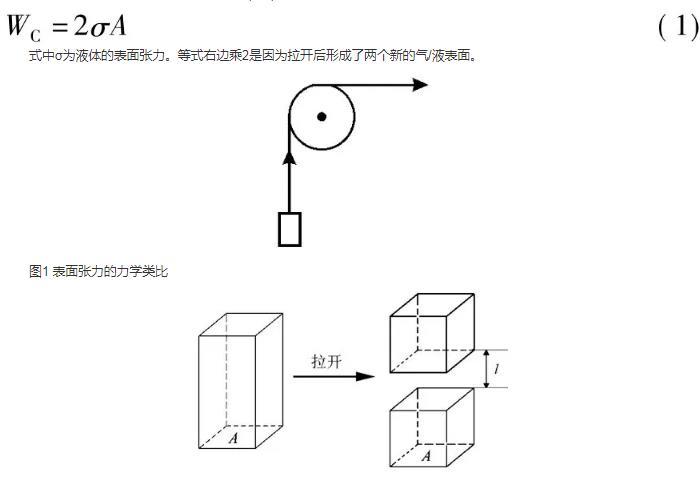 设想有一柱状液体,将它拉开分成两半(图2)。若液体的横截面积为A,则不难得到拉开时需做之功为: