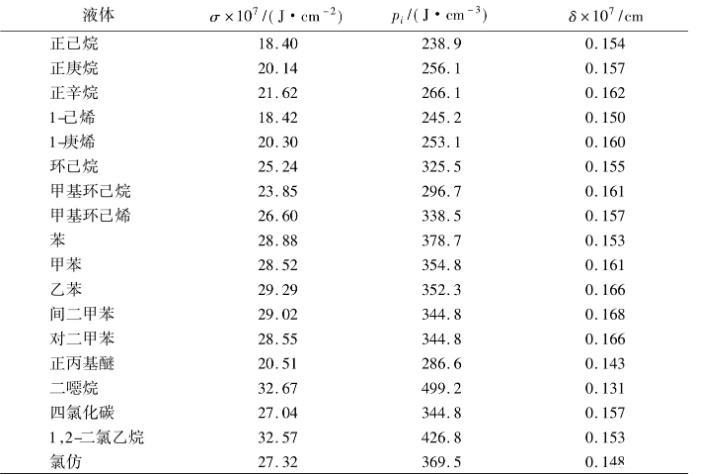 表1 293.15K时若干液体的表面张力、内压力和表面层厚度