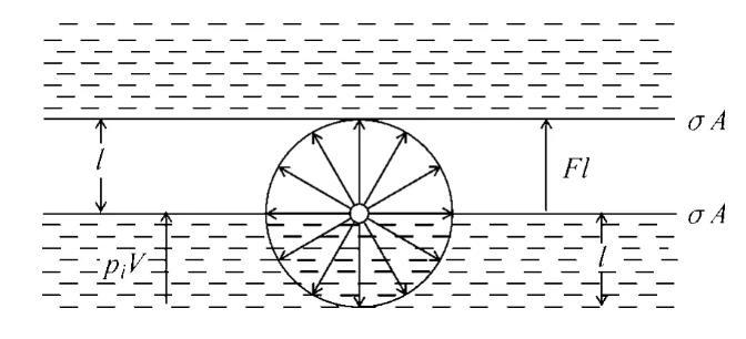 式中pi=(∂U/∂V)T是内压力的热力学定义,式(5)便是本文所得结果。由此可见,表面张力与内压力的关系是很简单的,它不仅说明了纵向作用的内压力与表面上横向作用的表面张力成正比,而且还能说明图1所示的力学类比。图3是该说明的示意图。