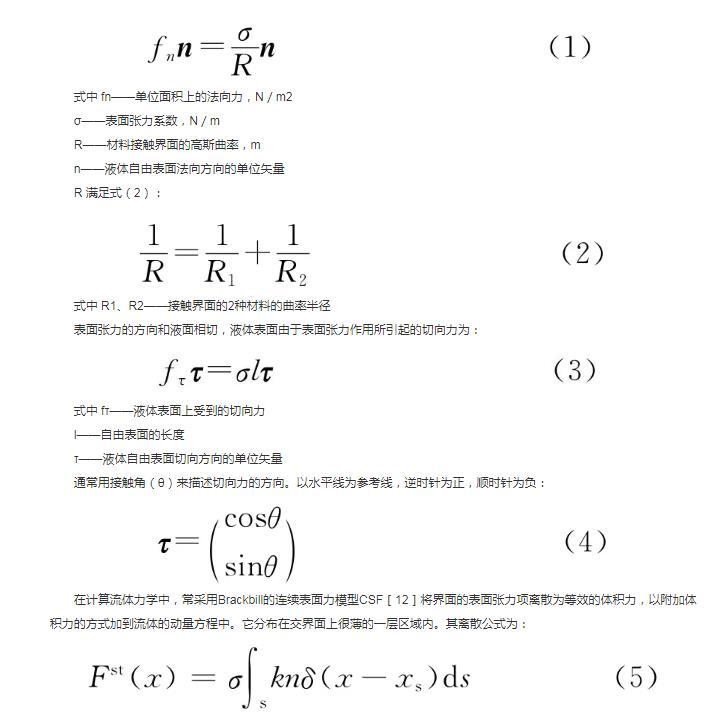 在计算流体力学中,常采用Brackbill的连续表面力模型CSF 将界面的表面张力项离散为等效的体积力,以附加体积力的方式加到流体的动量方程中。它分布在交界面上很薄的一层区域内。其离散公式为: