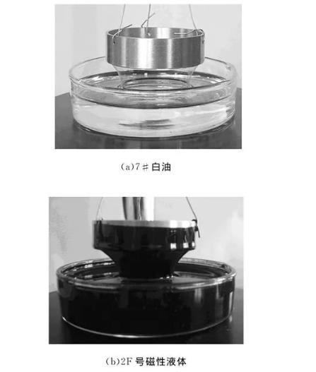 力敏传感器定标数据见表1,使用Origin软件对直线进行拟合,可得力敏传感器灵敏度B=7.727V/N.测量无外加磁场作用的磁性液体表面张力系数时,为直观观察拉脱时液膜的变化过程,将培养皿放置于电磁线圈端部进行测量,图3为拉脱过程中某一瞬间液膜的收缩状态,从图中可看到,磁性液体的液膜拉得更长,液膜收缩的趋势比白油更明显,这主要是因为磁性液体中加入的表面活性剂降低了其表面张力。可从表面张力形成原理来分析其中的原因:第一,液体表面张力系数的大小宏观上反映出液体表面具有自动收缩的趋势,表面张力系数较大的白油由于分子和分子之间的引力较大,表面层分子更容易向液体内部运动,某一拉力作用下,液膜断裂,不易拉起较长的液膜;第二,不同液体对同一种固体的浸润程度不一样,表面张力系数小的液体(0.03N/m左右),几乎能浸润一切固体;表面张力系数较大的液体,只能浸润某些固体;7#白油的表面张力系数大于磁性液体,片状吊环和磁性液体的结合力大于片状吊环和7#白油的结合力;液膜不容易和片状吊环脱离,拉起来的液膜比较长。