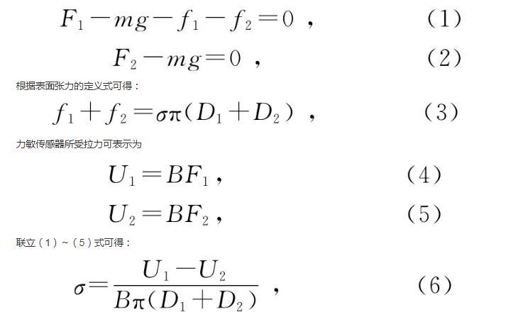 式中,F1和F2分别为液膜破裂前后瞬间片状吊环所受的拉力,f1和f2为片状吊环内外表面液体的表面张力,θ为表面张力与竖直方向的夹角。m为片状吊环的质量,D1和D2为片状吊环内外径,B为力敏传感器灵敏度,U1和U2为液膜破裂前后瞬间力敏传感器输出的电压值,σ为磁性液体的磁表面张力系数。