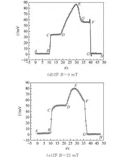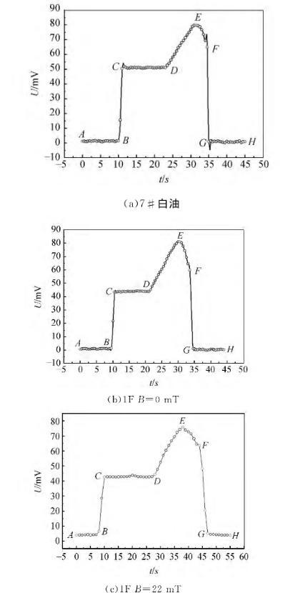 根据受力情况将图4的液膜拉脱过程电压变化曲线分为6个阶段,图5为液膜拉脱过程方框图,不同阶段片状吊环的受力情况不同,电压变化值也不同,在液膜破裂前后瞬间,忽略液膜的重力,表面张力与重力方向完全一致,此时F=mg+f1+f2,可得到液体的表面张力。由图4发现,不同液体在EF阶段的电压变化情况不同,无外加磁场作用时2F号磁性液体在EF阶段存在转折点Q,越过转折点,QF阶段电压变化较平缓,且表面张力越小;而7#白油和1F磁性液体并未出现此现象。出现该现象的原因是7#白油和1F磁性液体表面张力较大,当液膜被拉脱到一定程度时,很快破裂;而2F号磁性液体由于表面张力较小,液体分子与分子之间的作用力减弱,宏观表现为拉脱的液膜更长,液膜在空气中会存在一段时间,此时液膜质量很小,可忽略不计,电压变化较平缓。有外加磁场作用时,1F和2F号磁性液体在FG阶段并未出现电压变化平缓的中间过程,但有外加磁场作用于磁性液体时,FG阶段出现了一些数据点,液膜破裂的时间大于无外加磁场作用时的时间,主要是由于外加磁场增强了磁性颗粒之间的相互作用,分子和分子之间的磁吸引力增强,导致液膜逐步破裂。