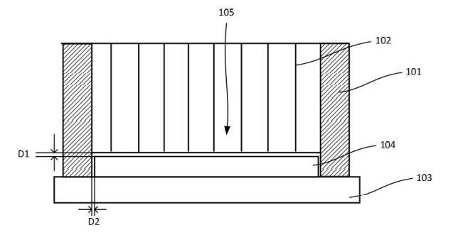 如图1所示,在一个实施例中,所述筒壁101的材质可以为聚合物、陶瓷、金属等耐腐蚀的材料,所述筒壁101的形状例如可以为圆柱状,所述筒壁101的径向宽度大于所述晶圆104的径向宽度,所述筒壁101套设于晶圆104外围时,所述筒壁101与所述晶圆104边缘之间的间距D2为30微米~500微米,如100微米、200微米、300微米等,以避免套设时碰撞晶圆104而造成晶圆104或筒壁101的损伤。