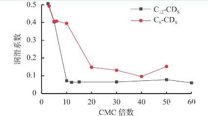 C12-CDS和C8-CDs的润滑效果存在明显差异,两者疏水烷基链长度不同,而烷基链长度可影响表面活性剂的表界面活性以及胶束的形成,推测是CDs形成的胶束在润滑过程中发挥作用,由此进一步探究CDs的胶束对润滑性能的影响,图2是CDs的硅酸钠溶液润滑系数与2种CDS各自的CMC倍数的关系曲线。
