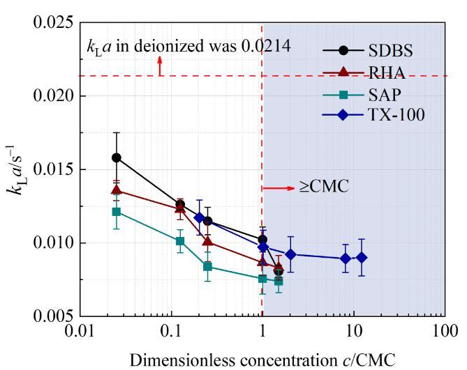 含表面活性剂微纳米气泡曝气系统的体积传质系数(kLa)值如图2所示。在四种表面活性剂溶液中,kLa值均随表面活性剂浓度增加而降低。当c/CMC小于1时,降低的趋势更明显。这说明少量的表面活性剂即可对传质产生显著影响。此外,非离子型表面活性剂对kLa的影响大于离子型表面表面活性剂。分子量大的RHA比SDBS具有更显著的传质抑制作用。