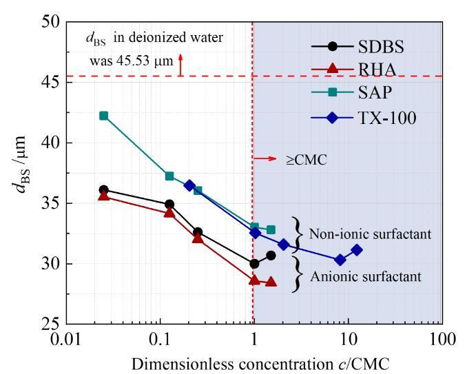 在不更新气泡表面和表面活性剂分子抑制凝聚的共同作用下产生了粒径更小的微纳米气泡。表面活性剂浓度大于CMC值的溶液中的微纳米气泡的粒径小于表面活性剂浓度小于CMC的溶液中的。该现象主要是因为当表面活性剂浓度小于CMC值时,表面活性剂分子不足以完全覆盖气泡表面。另外,如图1所示,随着浓度增加,微纳米气泡的粒径降低,当c/CMC值大于1时,溶液的表面张力达到了稳定值,但微纳米气泡的粒径持续减小。