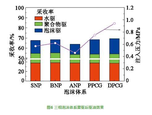 三相泡沫体系聚驱后驱油效果见图6。由图6可知,3支并联岩心水驱采收率约为38%,聚驱采收率约为17%,聚驱后DPCG三相泡沫体系注入压力和驱油效果最好,聚驱后采收率超过15%;PPCG体系次之,采收率超过14%。聚驱后SNP或BNP三相泡沫体系注入压力和驱油效果相对较差,聚驱后采收率约为13%。聚驱后ANP三相泡沫体系注入压力和驱油效果最差,但聚驱后采收率仍超过10%。