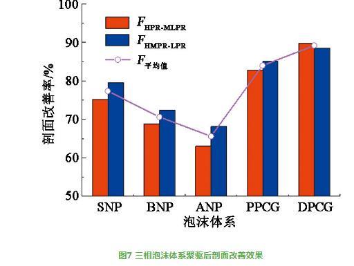 三相泡沫体系聚驱后剖面改善效果见图7。由图7可知,不同三相泡沫体系在高渗与中低渗层的剖面改善率(FHPR-MLPR)高于63%,在高、中渗与低渗层的剖面改善率(FHMPR-LPR)高于68%,平均改善率大于65%。其中DPCG或PPCG三相泡沫体系的FHPR-MLPR和FHMPR-LPR最好(超82%),DPCG三相泡沫体系的FHMPR-LPR低于FHPR-MLPR。SNP、BNP或ANP三相泡沫体系的FHPR-MLPR和FHMPR-LPR相对较差,但其FHMPR-LPR好于FHPR-MLPR。
