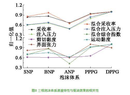 图8三相泡沫体系溶液特性与驱油效果的相关性