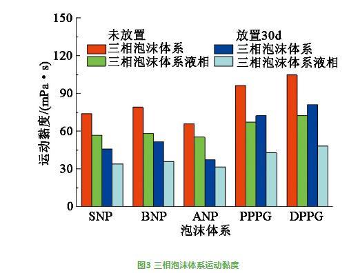 DPCG与DWS和聚合物具有较强的静电、范德华力和缠绕作用,使其三相泡沫体系具有较大的拉伸黏度、剪切黏度和黏弹性,导致DPCG三相泡沫体系运动黏度最大。而PPCG仅具有短支链,与DWS和聚合物的静电、范德华力和缠绕作用相对较弱,导致其运动黏度低于DPCG的。硬质纳米颗粒在溶液中与DWS和聚合物的静电、范德华力和缠绕作用较弱,因此其三相泡沫体系运动黏度较低。