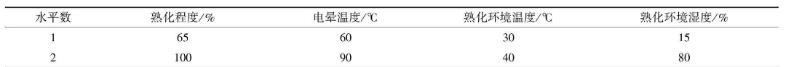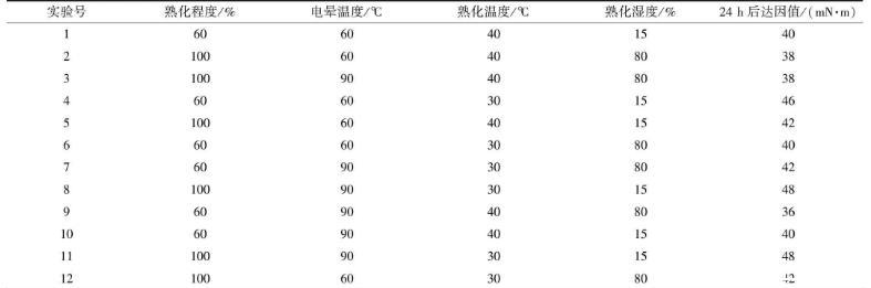 背板的表面张力受反应程度、电晕温度、熟化环境温湿度的影响较大,结合背板生产具体工艺参数,通过JMP软件定制试验设计四因子量连续水平的均匀试验,如表2所示。