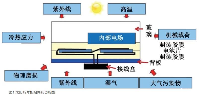 太阳能光伏背板位于光伏组件的背面,是光伏组件的重要组成部分,而背板作为直接与外部环境大面积接触的光伏封装材料,必须具备卓越的耐老化(湿热、干热、紫外)、耐电气绝缘、水蒸气阻隔、尺寸稳定等性能,为组件在各自长期恶劣环境下提供绝缘保护和支撑作用,如图1所示。