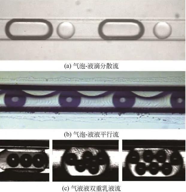 上述不同类型的微通道中所形成的流型也是学者们重点关注的内容。在材料制备领域,流型是决定合成材料结构的关键因素且直接影响着材料的相关性能;在过程强化领域,不同流型的强化效果差别较大,选择并调控合适的流型是重中之重;在三相反应中,流型可决定反应的转化率和选择性,是需要优化的重要参数之一。相比于两相体系,三相体系由于流体间更为复杂的相互作用及更高的自由度而呈现出了更多的流动形态(图3)。如Su等在十字形微通道中成功调控出液滴气泡间隔排列的气液液三相流。Xu等基于同轴环管微设备实现了气液液双乳液的可控制备,并揭示了流量和界面张力等因素对双乳液结构的影响。Wang等在双T形通道内通过调节操作条件可控制备了“水包油包气”和“含有气泡的液液平行流”两种结构。Rajesh等通过观察液滴气泡的形状及位置关系定义了“气柱-液柱”“弹状-液滴”“液柱-双气弹”等流型。除了实验手段Rajesh等借助VOF数值模拟方式从机理上揭示了气液液三相流的流动规律,归纳了不同Ca和We范围内的流型特征和规律。此外,Yang等通过传质引发相分离的方法成功调控出气液液双乳液,该方法能实现更大范围内气泡直径尺寸和液膜厚度的调节。