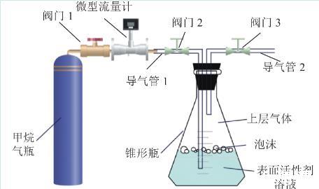 2)将待测250 mL表面活性剂溶液置于锥形瓶中,打开阀门2、阀门3,打开微型流量计,通过微型流量计控制气体以300 mL/min的速度通入锥形瓶液体中,每次试验通入50 mL气体。