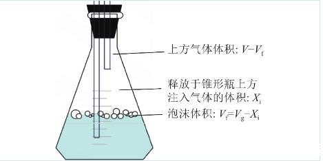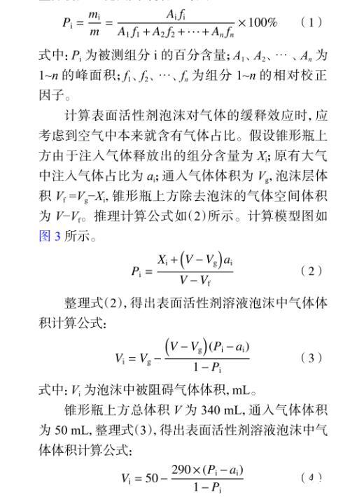 计算表面活性剂泡沫对气体的缓释效应时,应考虑到空气中本来就含有气体占比。假设锥形瓶上方由于注入气体释放出的组分含量为Xi;原有大气中注入气体占比为ai;通入气体体积为Vg,泡沫层体积Vf=Vg−Xi,锥形瓶上方除去泡沫的气体空间体积为V−Vf。推理计算公式如(2)所示。计算模型图如图3所示。