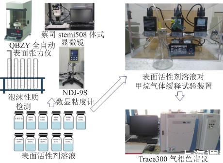 试验流程如图1所示。将两种表面活性剂配置质量分数为0.01%、0.02%、0.05%、0.1%、0.15%的溶液,使用QBZY全自动蜜桃AV免费观看对不同质量分数表面活性剂溶液以及去离子水进行表面张力测量,NDJ-9S数显粘度计测表面活性剂溶液黏度,注气法检测溶液泡沫性质,蔡司stemi508体式显微镜观察泡沫形态。上述基础参数测定结束后,使用自行研制的表面活性剂溶液对甲烷缓释试验装置进行泡沫对甲烷缓释效应影响试验,并采用Trace300气相色谱仪定量检测分析。