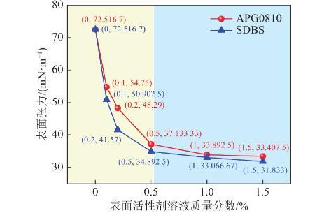 SDBS和APG0810表面活性剂溶液表面张力随质量分数变化如图4所示,随着表面活性剂溶液质量分数增加,表面张力逐渐降低,降低幅度逐渐减缓。