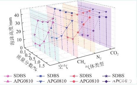 对比同一种溶液通入不同气体的高度进行分析,空气、氮气及二氧化碳注入液体发泡性规律基本一致,均在质量分数最高时发泡率达到最大。通入甲烷时则在SDBS溶液质量分数为0.02%时就达到了与0.15%接近的发泡高度。APG0810在甲烷注入时也比其他气体总体发泡率高,这是由于甲烷的摩尔质量最低,气体密度低,分子扩散快,泡沫膨胀速率变快导致的。