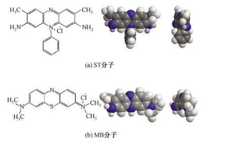 为了更清晰地了解界面组装中使用的亚相溶液特征,把所选的ST和MB染料分子进行了二维和三维空间填充模型正面、侧面的表示,如图6所示,可以更直观地观察到两种分子结构上的差异。它们的相似之处在于,都含有较大的杂环共轭体系,可以在LDH-HS复合LB膜中形成H-和/或J-型的聚集体。这也就对应于前面提到的LDH-HS/染料复合膜在透射电镜和原子力显微镜下观测到的不同形态的聚集体。也正是由于LDH-HS分子片层为染料分子提供了合适的生长平台,在LB技术的帮助下在气-液界面之间形成了高质量的、均匀致密的LDH-HS/染料分子聚集体。