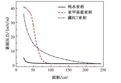 图1 LDH-HS薄膜在纯水、MB和ST亚相中的表面压力-面积(π-A)等温线