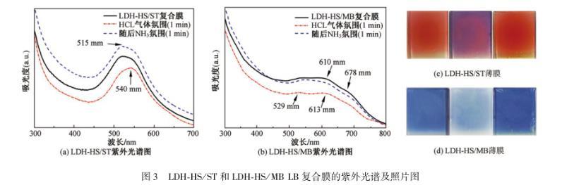 图3(a)和3(b)分别显示的是LDH-HS/ST和LDH-HS/MB多层LB复合膜沉积在石英底片上测得的UV光谱,以及经1 min HCl气体氛围处理后和1 min NH3气体氛围处理后的UV变化光谱图。图3(c)和3(d)对应展示了LDH-HS/ST和LDH-HS/MB复合膜酸碱气体氛围下石英片颜色变化前后对比图。