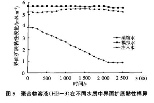 图4聚合物溶液(HB-3)在不同水质中界面扩展弹性模量