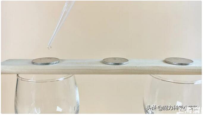 1.用两只玻璃杯架起小木片,三枚硬币并排摆放在小木片上。