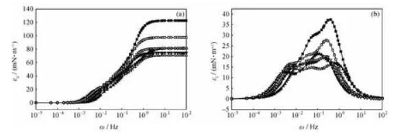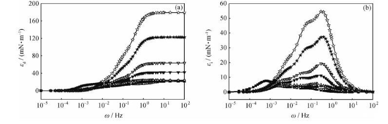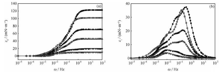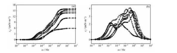 当频率较低时,界面张力梯度在实验时间内几乎可以完全消除,由于界面形变所造成的能量变化几乎完全耗散在环境中,对扩张模量的贡献可以忽略,εi接近于零;当频率较高时,各种弛豫过程来不及发生,对扩张模量的影响也可以忽略,εi仍然接近于零;只有在适宜的频率范围内,εi随频率变化而变化,并在其弛豫过程的特征频率处出现极大值。