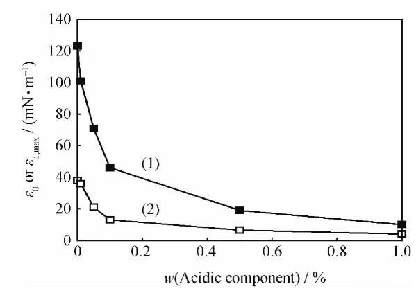 含不同量酸性组分的煤油-1750mg/L HMPAM溶液体系的界面扩张弹性和扩张黏性全频率谱示于图5,其极限扩张弹性和扩张黏性最大峰值示于图6。从图6可以看出,随着酸性组分量的增加,ε0和εi,max逐渐减低,这与固定酸性组分浓度改变聚合物浓度得到的实验结果相一致。