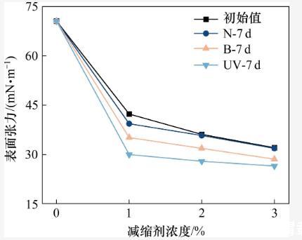 据以往研究,SRA在水泥基材料表面的吸附率通常在10%以下,90%以上的SRA分子溶于溶剂中(包含吸附在气液界面上的部分)。因此,SRA减缩的理论基础主要是毛细管张力理论。为了进一步探索减缩剂在强紫外线辐射环境下的作用机理,测试了减缩剂溶液的初始表面张力,以及溶液经过3种不同环境(N,UV,B)处理7 d后的表面张力。试验结果如图8所示。