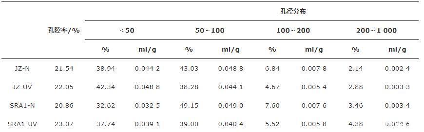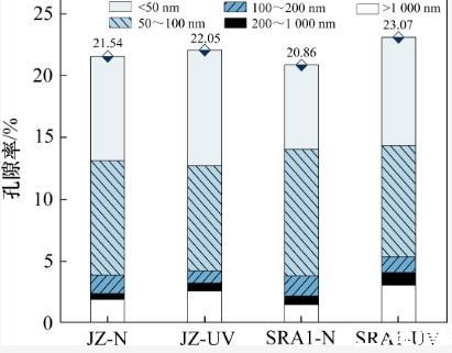 由图7和表5可以看出:强紫外线辐射使各组样品的总孔隙率、介孔率(2~50 nm)及大孔率(尤其是200 nm以上的孔)增加,由于弯月面的表面张力效应,介孔的毛细管产生更高的毛细管应力,导致暴露在强紫外辐射环境中的水泥石产生更大的干燥收缩。同时,经过强紫外线照射后,样品中大于200 nm的孔隙比例增加。这是由于强紫外线辐射环境下,水泥净浆的水化程度降低及水分散失增加导致的。