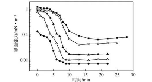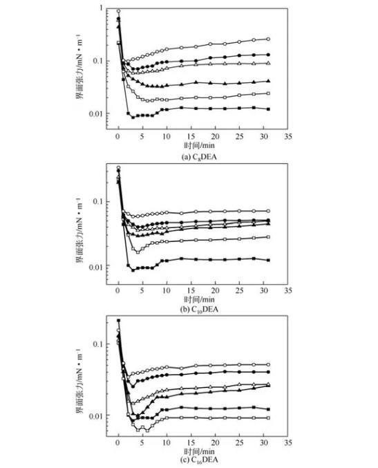 从图8可以看出,随C14DEA浓度增加,体系油水界面张力大幅降低,达到最低界面张力时间缩短,当质量分数大于0.1%时,油水界面张力能达10−3mN/m数量级,与CnDEA复配规律一致。