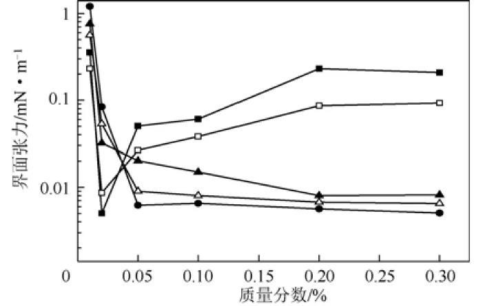 图2不同烷醇酰胺油/水界面张力稳定值随质量分数的变化曲线