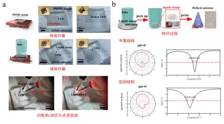 当液体印章与待转印器件/单元结合时,液滴对器件进行包裹,进而实现保护器件的作用。相比于传统弹性印章转印方法,液体的流变特性充分发挥作用,使得薄膜器件更容易转印到多种复杂的空间曲面上。通过对固-液界面粘附力的理论分析,提出了基于液滴印章的转印技术,实现了柔性薄膜的高度精确可控转印,并通过实验证实了理论模型的正确性与该转印方法的可行性。研究人员通过液体印章转印方法,成功实现了30微米超薄LED芯片的转印集成(图2a为传统印章和液滴印章转印对超薄LED芯片转印结果的对比)与锥螺旋微天线与异形曲面的转印集成(图2b)。此方法利用了表面张力和毛细作用,可以实现转印期间印章-薄膜作用力的精确调控,进而能够高效、高质量地完成超薄器件的转印;利用二维制备工艺和转印技术,实现了立体空间微结构和异形界面的集成,为曲面电子器件的设计与制备提供了一种新的方案。