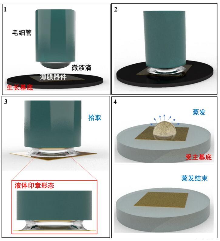 针对当前转印技术中存在的问题,研究人员结合接触式和非接触式转印的特点,提出了一种基于表面张力的液滴转印方法,利用液体的流变特性,通过毛细管对液滴形态的控制,调控固-液界面的粘附力,从而实现柔性器件的转印,该方法减少了超薄柔性器件的转印过程中印章对器件的损伤,同时也为曲面电子器件的制造提供了新的思路。