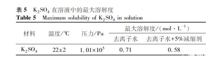 从图4b中还可以看出,A组中SO42-的初始浓度更高,随着水化反应的进行,SO42-被OH-取代,A组中置换出的OH-更多,OH-浓度也更高。A组中SO42-的初始浓度更高可能是因为SRA降低了孔隙溶液的极性,使得硫酸盐溶解和电离到这种“低极性”溶剂中的能力降低。验证这一假设需要研究硫酸盐在SRA中的溶解情况,这里以K2SO4为例测试其最大溶解度,在10g去离子水中以0.1g每次加入K2SO4粉末。