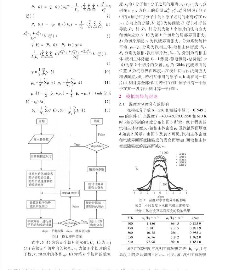 水是许多化学反应过程廉价的反应溶剂,也是化工生产过程常用的工质。汽液界面行为是研究水相变传热问题的基础。目前,工程上许多有关水蒸发、水蒸气冷凝、加热干燥等相变传热数据仍主要依赖于实验。随着分子模拟技术的发展,采用分子动力学模拟方法,从分子水平揭示水汽液界面特性的研究,引起了国内外许多学者的极大关注。本文拟采用SPC模型,对水汽液界面特性进行平衡分子动力学模拟研究,探讨温度、截断半径、模拟分子数对水汽液界面特性的影响规律。