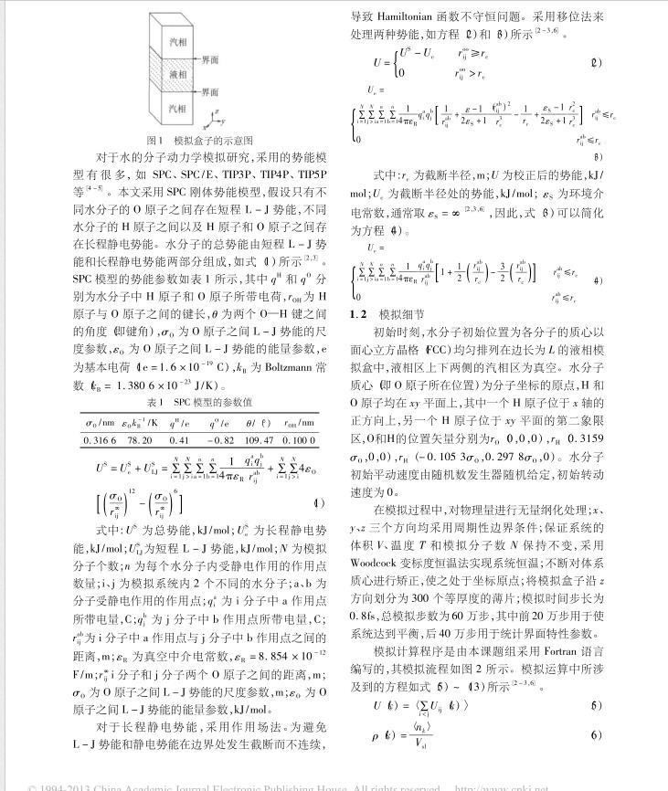 式中:US为总势能,kJ/mol;为长程静电势能,kJ/mol;为短程L-J势能,kJ/mol;N为模拟分子个数;n为每个水分子内受静电作用的作用点数量;i、j为模拟系统内2个不同的水分子;a、b为分子受静电作用的作用点;为i分子中a作用点所带电量,C;为j分子中b作用点所带电量,C;为i分子中a作用点与j分子中b作用点之间的距离,m;εR为真空中介电常数,εR=8.854×10-12F/m;i分子和j分子两个O原子之间的距离,m;σO为O原子之间L-J势能的尺度参数,m;εO为O原子之间L-J势能的能量参数,kJ/mol。