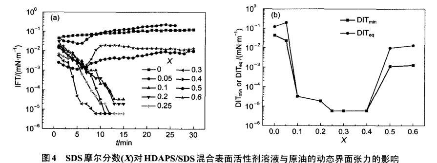 图4 SDS摩尔分数(X)对HDAPS/SDS混合表面活性剂溶液与原油的动态界面张力的影响